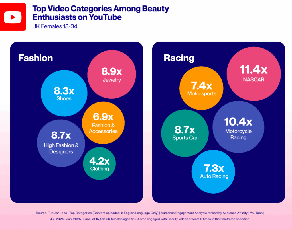 At first glance, Beauty and Motorsports might seem worlds apart. But Tubular’s data found that UK female Beauty viewers are 11.4x more likely to watch Motorsports content than the average viewer.