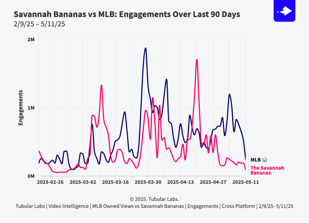 This very untraditional approach to the sport of baseball has put the Savannah Bananas on the same playing field (literally and figuratively) as the MLB itself. In the past 90 days, the Bananas are nearly tied for social video engagements with MLB-owned content across platforms.