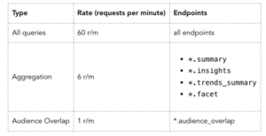 Chartbeat reserves the right to throttle Customer’s use of the Tubular API if in Chartbeat’s reasonable judgment throttling is necessary to preserve the quality of the Services. Tubular charges a fee for API access, and pricing is based on expected usage. Tubular limits how many queries can be done per minute. These limits are needed to avoid sporadic spikes of load. Customer can choose if they want their quota to be applied on a monthly or quarterly basis.