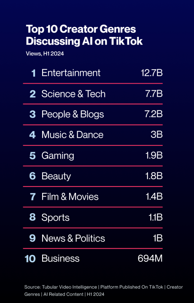 AI is still finding its footing within the vast social media ecosystem. Discussions surrounding artificial intelligence are growing, particularly among creators. The most viewed creator category in H1 2024 was Entertainment. Here, creators are not just talking about AI; they’re embracing it in innovative ways that resonate with audiences.