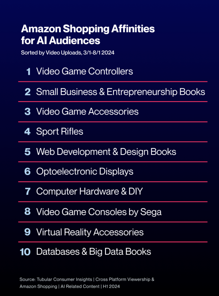 Delving deeper into consumer behavior, Tubular’s Consumer Insights reveal those engaged with AI content are primarily shopping for tech-related items on Amazon. This tech-centric focus underscores that AI is still in its early stages of widespread adoption. As diverse audiences begin to engage with this technology, we can anticipate shifts in shopping behaviors, expanding beyond tech into various lifestyle and consumer goods.