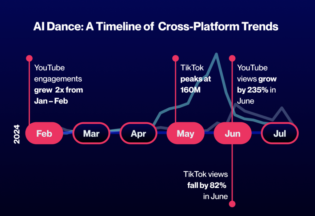 One of the most viral artificial intelligence trends of the year is the explosion of AI dance videos across social platforms. Thus far in 2024, users have been superimposing their faces onto AI-generated dancing bodies. This trend kicked off on YouTube in January, saw spikes in February and March, and hit a peak of 169.5 million views on TikTok in June.