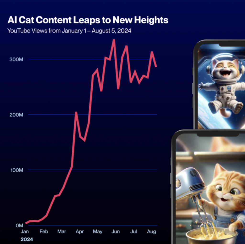 In an unexpected twist, the emergence of AI-generated content featuring cats has captured the internet’s heart. The creator Yunus Duygulu launched “Tales of AI Cats,” a series of humorous and touching stories accompanied by AI-generated images of endearing felines. This niche quickly exploded in popularity, amassing an astounding 9 billion cross-platform views from January to August 2024, with YouTube making up the largest portion.