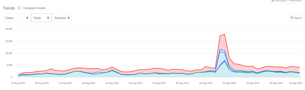 On September 13th, 2022 the world was finally treated to the first official The Legend of Zelda: Tears of the Kingdom trailer. It was viewers’ first look at the highly anticipated game. Tubular social video analytics indicate a massive increase in viewership on YouTube, up by 153% from 40.9M views in August to 62.2M in September.