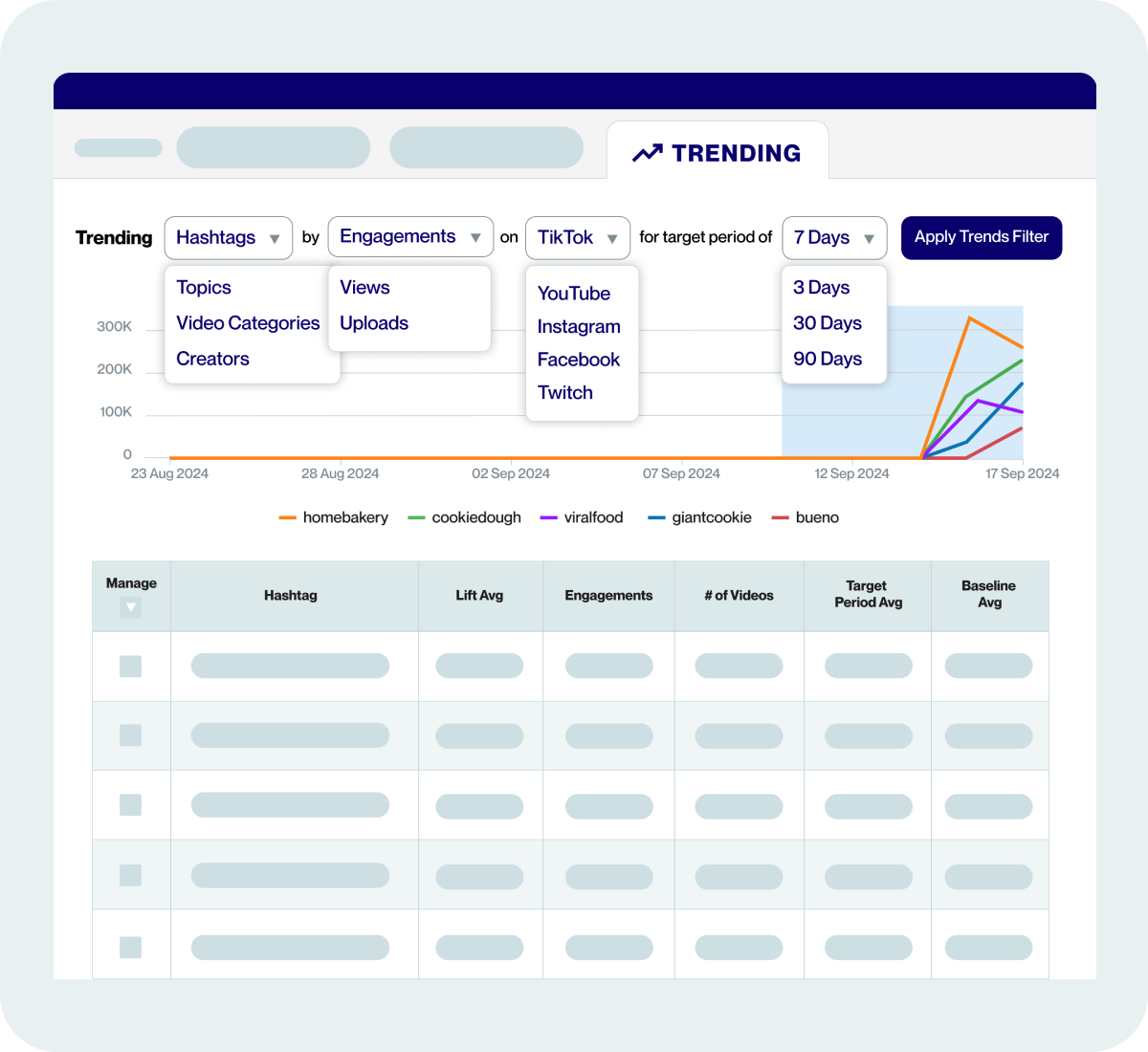 Trending makes it easy to spot which Creators, Topics, Hashtags, or Video Categories are outperforming the status quo.