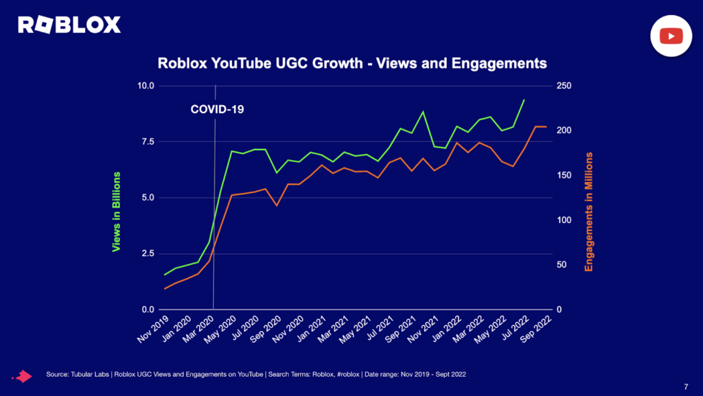 “Early on, we knew there was a very strong correlation between [social video] viewership and active users on the platform. If a user was watching Roblox YouTube video it was also very likely that they were using the platform at the same time”.