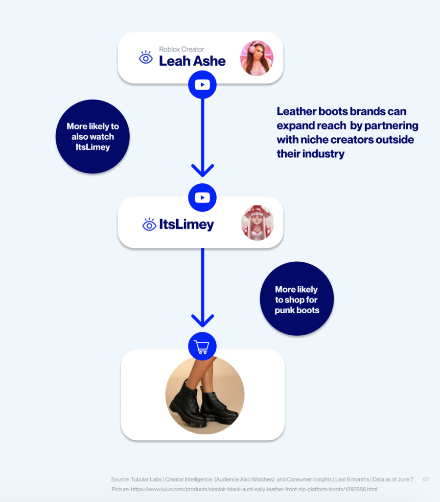 Leah Ashe is a broad-reach Roblox creator with 1M unique monthly viewers in June 2022. Tubular Intelligence reported her massive audience is 993X more likely to also watch niche creator, ItsLimey, who focuses on a fashion game within the Roblox world. ItsLimey’s audience is filled with fashion-loving gamers who are 27X more likely to purchase punk boots than other audiences.