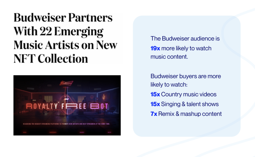 When Budweiser launched its very first NFT collection, the brand aligned its concept with its consumers’ entertainment preferences. Their NFT collection features 22 emerging musicians. No surprise, their consumers’ viewing behaviors indicate the Budweiser crowd has a high affinity for country music, singing & talent shows, as well as remixes & mashups.