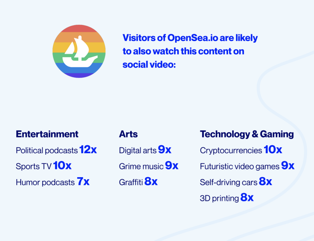 Social video insights tell us what NFT communities are interested in. Visitors of the popular NFT site, OpenSea.io, are likely to watch content on podcasts, arts, and new wave technologies like self-driving cars and futuristic video games. With this information, brands & creators decide what their next NFT project could look like.