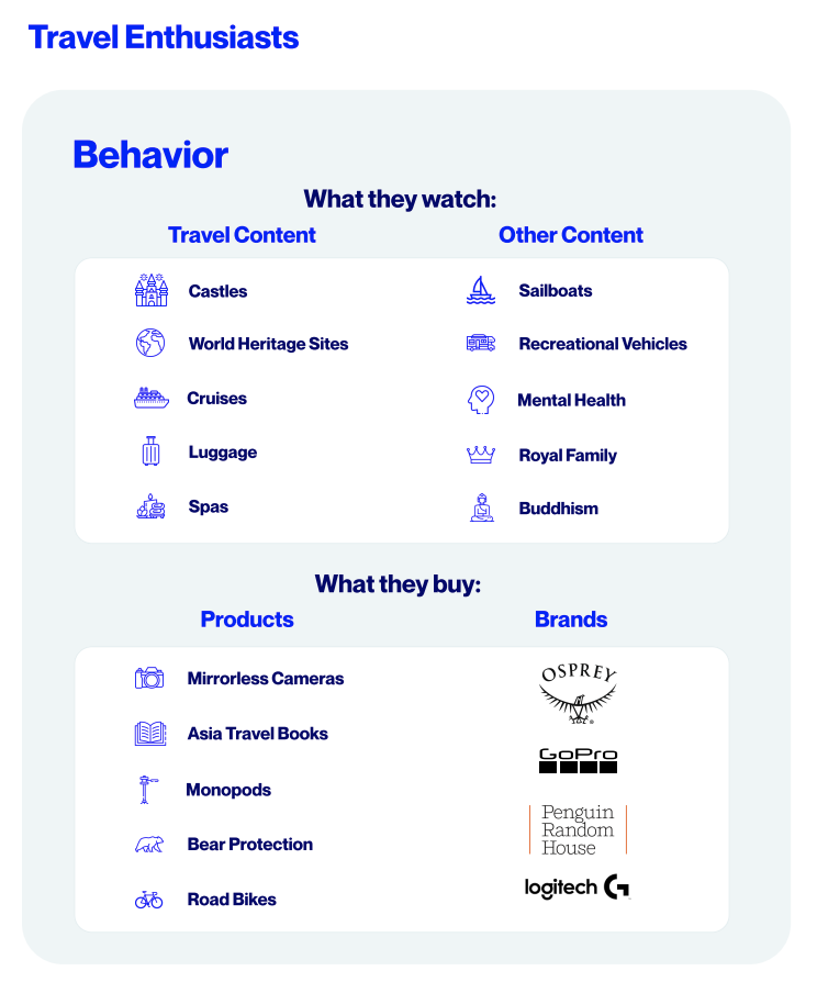 There’s a strong connection between what people buy and what they watch on social video. Tubular’s Consumer Insights found that Travel enthusiasts who watch content about cruises, spas, luggage, and castles are likely to shop for cameras, travel books, bear protection, and road bikes. These experience seekers exhibit a high affinity for brands like Logitech, GoPro, or Osprey.