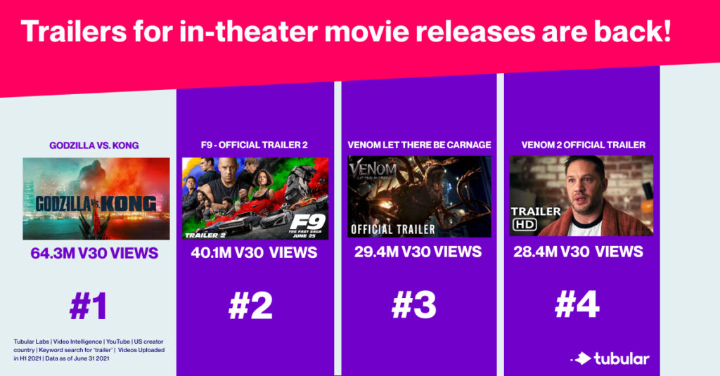 The wait paid off! Tubular data shows all 4 movies at the top of the leader board premiered in Theaters. Leading the pack is Godzilla vs. Kong, which aired in theaters and on HBOMax streaming.