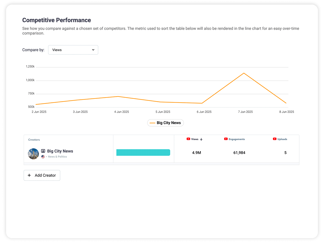 Track and compare views, engagements, and uploads for virtually any creator on social.