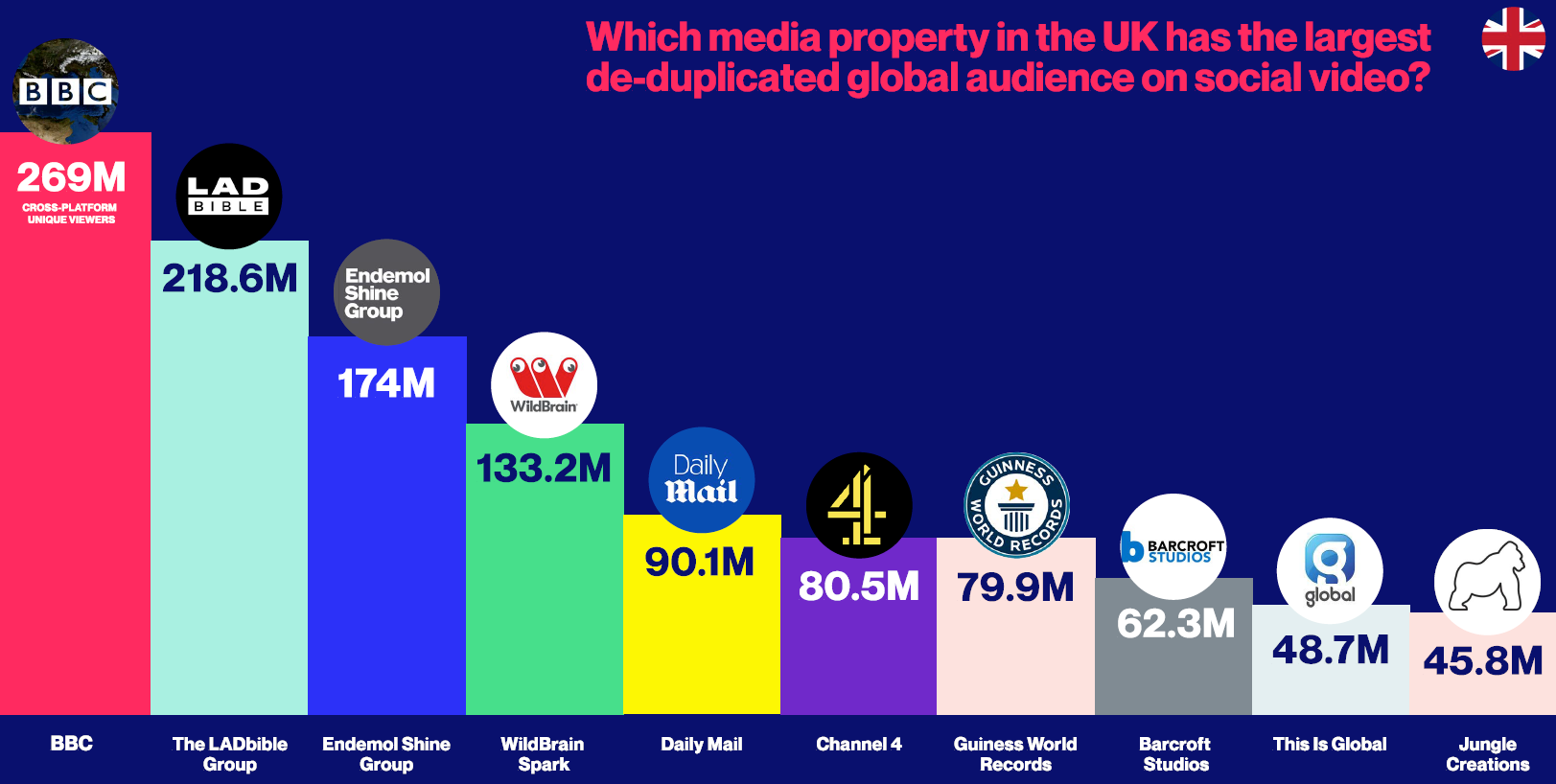 BBC landed at #1 with 269M unique cross-platform viewers, with The LADbible Group also claiming over 200M views. Endemol Shine and WildBrain Spark were #3 and #4, respectively, with over 100M unique views each.
